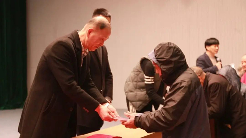 活動現(xiàn)場,步陽集團黨委書記程明松將紅包助困金交到受助人手中,并握手表達關(guān)心。