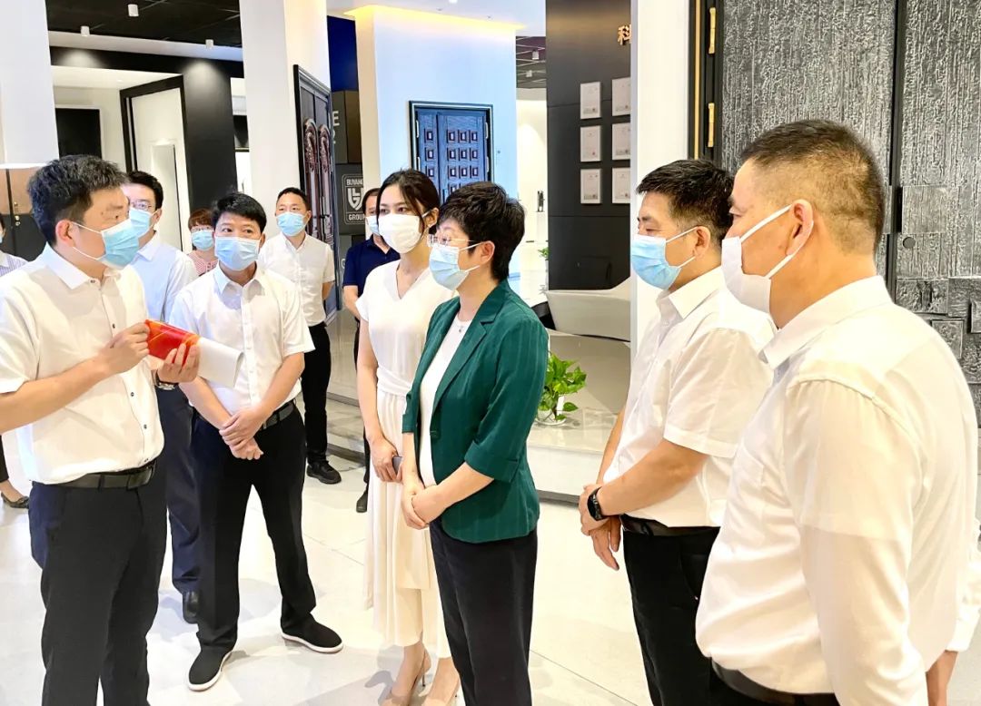 在徐董事長的介紹下,蔡主席詳細(xì)了解步陽目前的生產(chǎn)經(jīng)營、技術(shù)創(chuàng)新和市場(chǎng)戰(zhàn)略布局規(guī)劃,對(duì)步陽集團(tuán)多年來深耕門業(yè),聚焦實(shí)體經(jīng)濟(jì),帶動(dòng)永康市經(jīng)濟(jì)發(fā)展給予贊許和肯定。當(dāng)聽到徐璟珺委員介紹門的文化、門的故事,特別是一樘門可以通過表面多種材料的運(yùn)用進(jìn)行定制化生產(chǎn)后,對(duì)步陽近年來市場(chǎng)需求把控和產(chǎn)品技術(shù)研發(fā)創(chuàng)新,并建立起步陽特色的研發(fā)路線與企業(yè)競爭力的做法表示高度認(rèn)可。