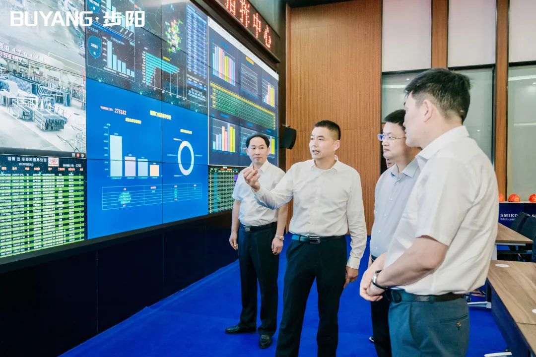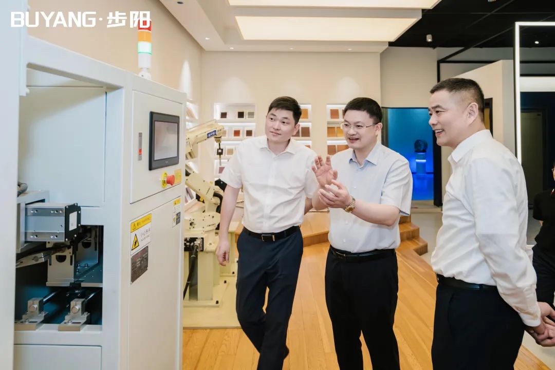 集團董事長徐步云陪同呂書記一行參觀了步陽科技館、黨建中心及門成品展廳/汽輪/大數(shù)據(jù)中心,步陽工匠室、5G智能流水線,并聽取總經(jīng)辦副總經(jīng)理朱寧介紹公司科技創(chuàng)新轉(zhuǎn)型、生產(chǎn)自動化流水線等相關介紹解說。